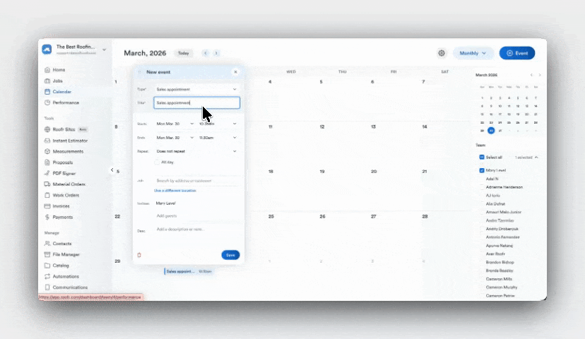 Roofr now supports Repeating Calendar Events, letting owners and admins set any event- site visits, follow-ups, team check-ins- to recur on a daily, weekly, monthly, or custom schedule. Once it's configured, your team's calendar runs consistently without anyone having to rebuild the same events from scratch.