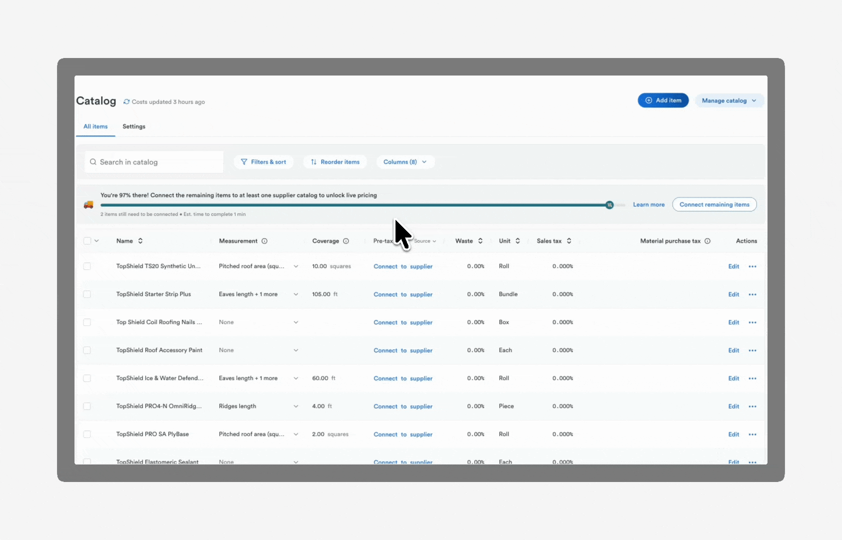 1.6 Suppliers Users receive automatic material order status updates from integrated suppliers (ABC, QXO, and SRS). Learn more